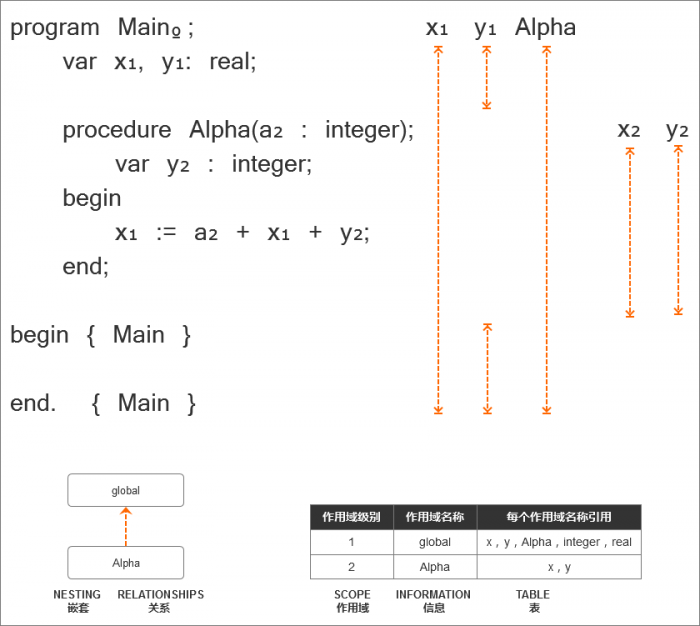 除了全局作用域之外,Pascal还支持嵌套过程,并且每个过程声明都引入了一个新作用域,这意味着Pascal支持嵌套作用域。